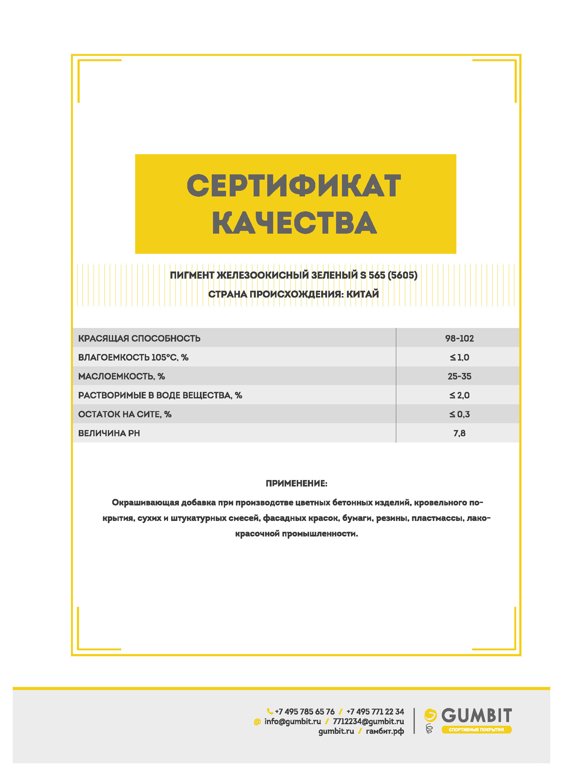 Зелёный краситель для резиновой крошки — это железоокисный пигмент, который используют для окрашивания гранулята. Он придаёт материалу яркий оттенок, который не вымывается под воздействием осадков и не тускнеет от солнечных лучей. Удобен в применении.