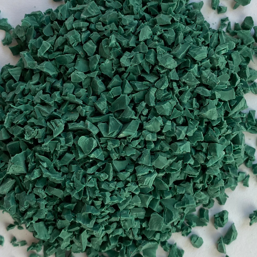 Зелёная крошка TPV (бирюзово-зелёный по RAL) — оптимальное решение для объектов, рассчитанных на долгий срок службы. Такое покрытие успешно противостоит практически всем признакам старости, которым подвластны конкуренты из резиновой крошки. TPV на протяжении многих лет сохраняет упругость и первоначальный цвет, не деформируется и не разрушается. Кроме того, TPV отлично справляется с различными температурами: не трескается на морозе, отлично чувствует себя на жаре и не подвержено воспламенению.
